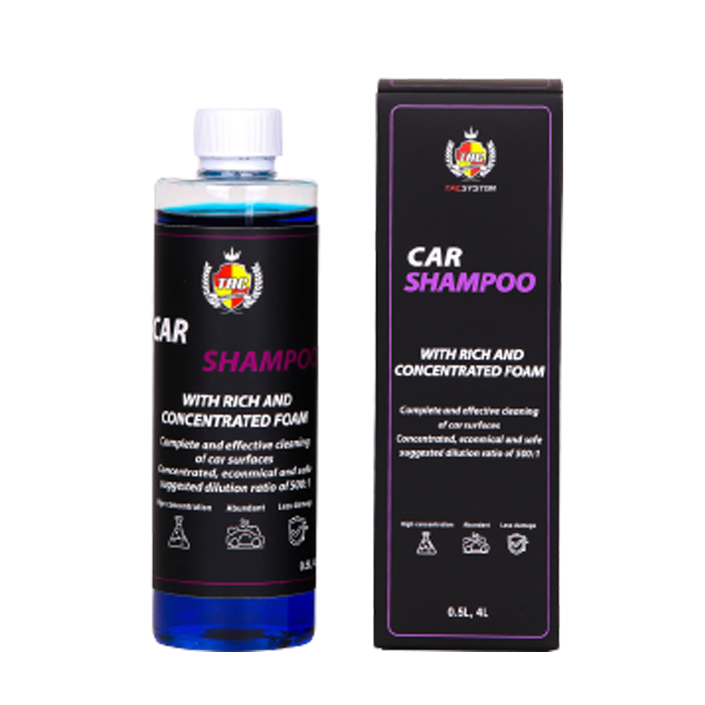 First rinse vehicle free of all loose topical contamination using a high pressure nozzle or pressure washer. Next, prepare a bucket water and squeeze in CAR SHAMPOO with a dilution 1:10~1:100 rate, using diluted CAR SHAMPOO to wash the whole paint surface well. Then rinse the whole vehicle thoroughly with water.